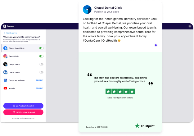 Practina NOW integrates with Demandforce and Trustpilot, alongside existing platforms like Facebook, Google My Business, and Yelp. Connect your profiles, and we'll aggregate your reviews in one place. Plus, with our new feature, generating responses to your reviews is streamlined, helping you engage with your audience more effectively.