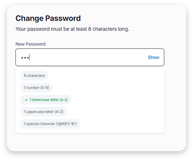 We’ve raised the bar on password protection. Now, your login must meet global security standards: minimum 8 characters, numbers, uppercase, lowercase, and special characters.