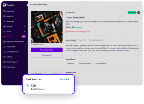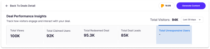 Get full visibility into how your audience engages with your offers, from total views and unique visitors to claimed, redeemed, and dropped leads.