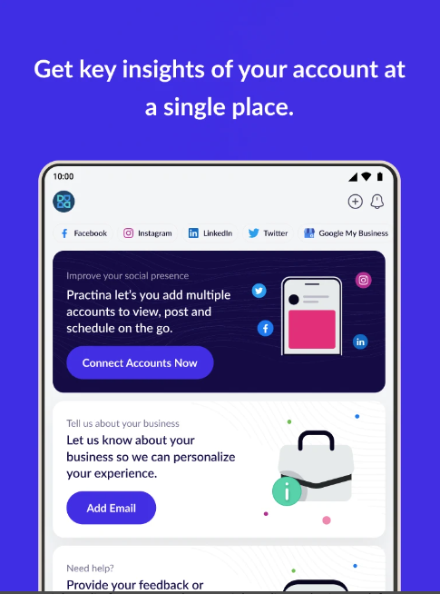 Practina supports all these platforms – Facebook, Instagram, LinkedIn, Twitter, Google My Business, YouTube, and Yelp.